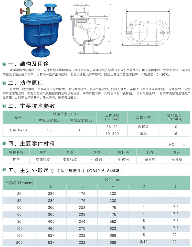 當管內開始注水時,閥瓣處在開啟位置,進行大量排氣,當空氣排完時,閥內充滿水,浮球上升并帶動閥瓣關閉,停止排氣,當管內水正常輸送時,如有少量空氣聚集在閥內到相當程度,閥內水位下降,浮球隨之下降,此時空氣由小孔排出。當水泵停止時,管內水流空或遇管內產生負壓,此時塞頭迅速開啟,吸入空氣,確保管線安全。