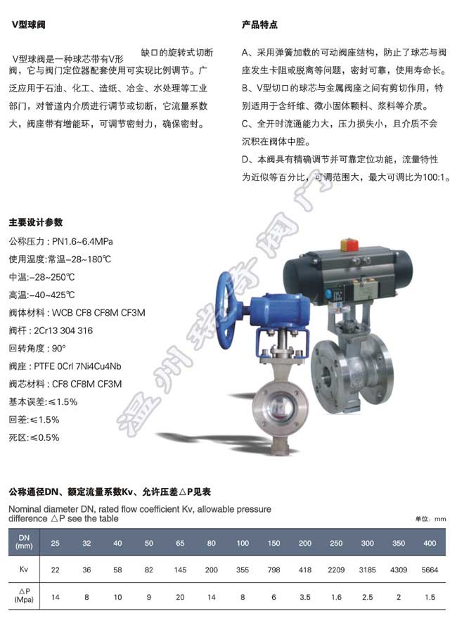 V型球閥是球閥的一種,它的關閉件是半球體上開有V字型開口,V型開口具有鋒利的刃口,在球體回轉過程中,關閉件之間有擦拭作用,對介質具有強有力的切斷力,球體的V型開口與閥座流道形成一個扇形區域,在回轉過程中可改變流道截面積,形成對介質的精確調節,它是一種角回轉的調節閥,其密封性能與普通球閥相同,使它同時具備調節和開關兩種功能,與氣動或電動執行器配套,廣泛使用于工業過程自控系統中。產品特點: