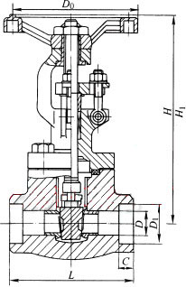 Z61H、Z61Y、Z61W 型 PN100~PN160 承插焊楔式閘閥主要外形及結(jié)構(gòu)尺寸(mm)| DN | L | D | D1 | C | H | H1 | D0 | 重量/kg |